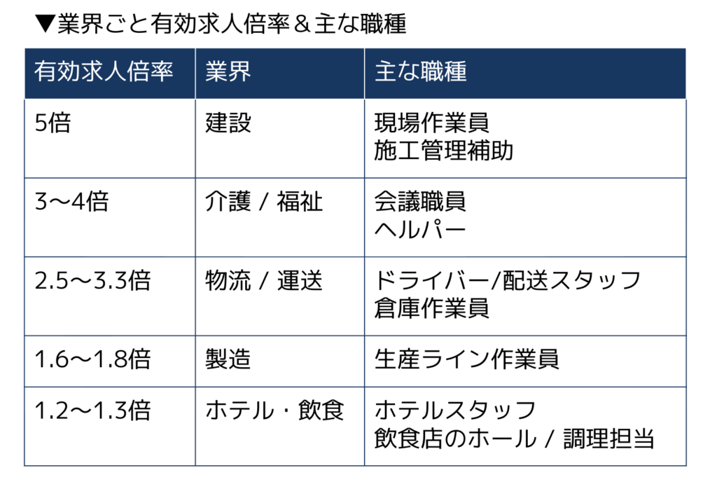 ①まずは有効求人倍率が1倍を超える「採用されやすい業界」を狙う
